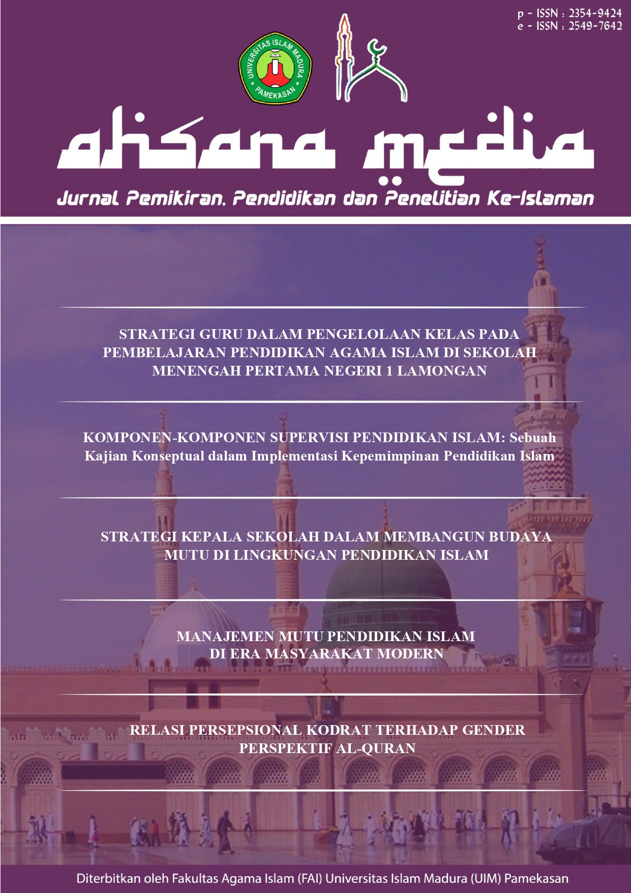 Vol. 11 No. 2 (2025)Ahsana Media: Jurnal Pemikiran, Pendidikan dan Penelitian Ke-Islaman dengan nomer ISSN. 2354-9424 e-ISSN. 2449-7642 adalah Jurnal yang diterbitkan oleh Fakultas Agama Islam (FAI) Universitas Islam Madura dengan durasi tebitan 2 kali dalam satu tahun, yaitu pada bulan Februari dan bulan Juli disetiap tahunnya. Pada periode Juli tahun 2025 Vol. 11. No. 2 merupakan terbitan yang memfokuskan kepada pengembangan pendidikan Agama Islam dan beberapa pembahasan keislaman yang terjadi di tengah-tengah masyarakat, bahasan tersebut diantaranya adalah: EFEKTIVITAS PENGGUNAAN MEDIA VIDEO YOUTUBE DALAM PEMBELAJARAN SEJARAH KEBUDAYAAN ISLAM TERHADAP HASIL BELAJAR PESERTA DIDIK KELAS VII DI SMPN 3 WARU yang ditulis oleh Najwa Nur Yazidah, Abd. Muqit. STRATEGI GURU DALAM PENGELOLAAN KELAS PADA PEMBELAJARAN PENDIDIKAN AGAMA ISLAM DI SEKOLAH MENENGAH PERTAMA NEGERI 1 LAMONGAN yang ditulis oleh Nur Hidayah Firdaus Sa’arani, Wiwin Luqna Hunaida. MEMAHAMI FOKUS PELANGGAN DALAM PENDIDIKAN IALAM: Sebuah Pendekatan Akademik Dalam Manajemen Mutu yang ditulis oleh Ikhwanul Muttaqin, M. Sahibudin. KOMPONEN-KOMPONEN SUPERVISI PENDIDIKAN ISLAM: Sebuah Kajian Konseptual dalam Implementasi Kepemimpinan Pendidikan Islam yang ditulis oleh Supandi dan Kurratul Aini. KARAKTERISTIK SUPERVISI AKADEMIK HUMANIS: Transformasi Pendampingan Guru Menuju Pembelajaran Bermutu yang ditulis oleh Moh Salim Ghazali, Atnawi. STRATEGI KEPALA SEKOLAH DALAM MEMBANGUN BUDAYA MUTU DI LINGKUNGAN PENDIDIKAN ISLAM yang ditulis oleh Afina Fajriana, Abd.haris. TRANSFORMASI SUPERVISI PENDIDIKAN DI INDONESIA: Kajian Sejarah, Prinsip, dan Tantangan yang ditulis oleh Abdul Hobir, Abdul Munib. MANAJEMEN MUTU PENDIDIKAN ISLAM DI ERA MASYARAKAT MODERN yang ditulis oleh Nuril Fauqiyah, Moh. Subhan. KOLABORASI STAKEHOLDERS DALAM PENERAPAN MANAJEMEN MUTU TERPADU DI LEMBAGA PENDIDIKAN ISLAM yang ditulis oleh Ach. Farhan, Syamsul Rijal. RELASI PERSEPSIONAL KODRAT TERHADAP GENDER PERSPEKTIF AL-QURAN yang ditulis oleh Danial Achmad.